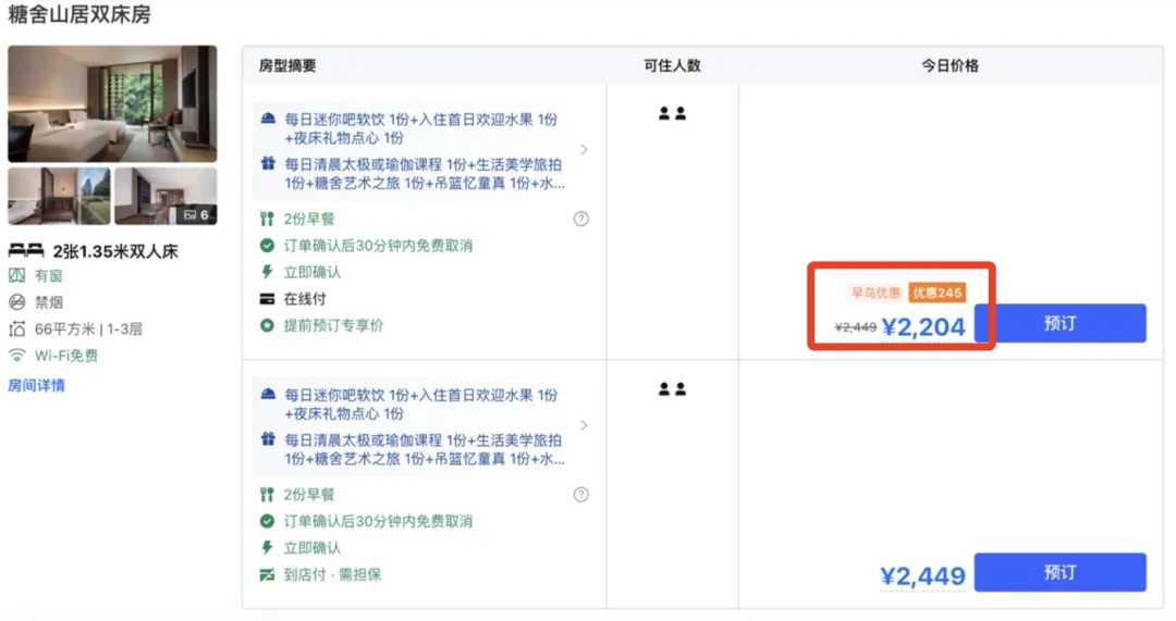 糖舍山居大床房2晚+双早+旅拍等,2699元,有效期到明年3月底,周末、元旦、春节有加价。