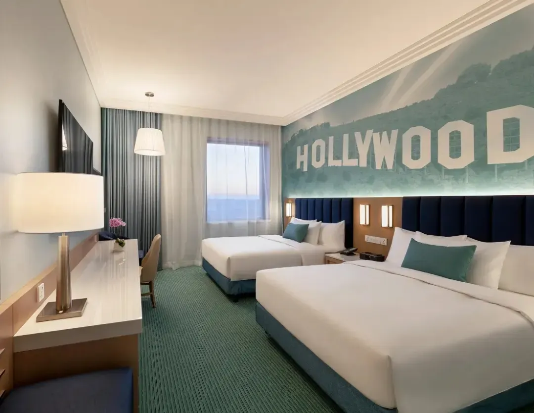 豪华双大床房1晚+指定单日门票2张(限18-25岁)+提前1小时入园权益等,1570元。有效期到明年1月8日,热门日期有加价。