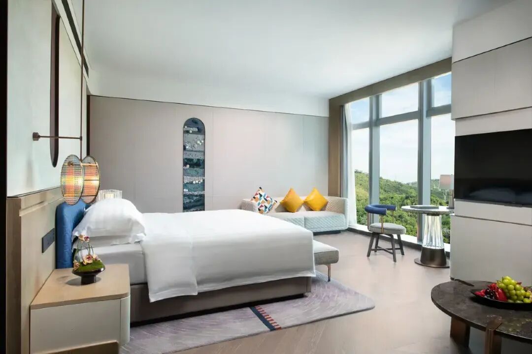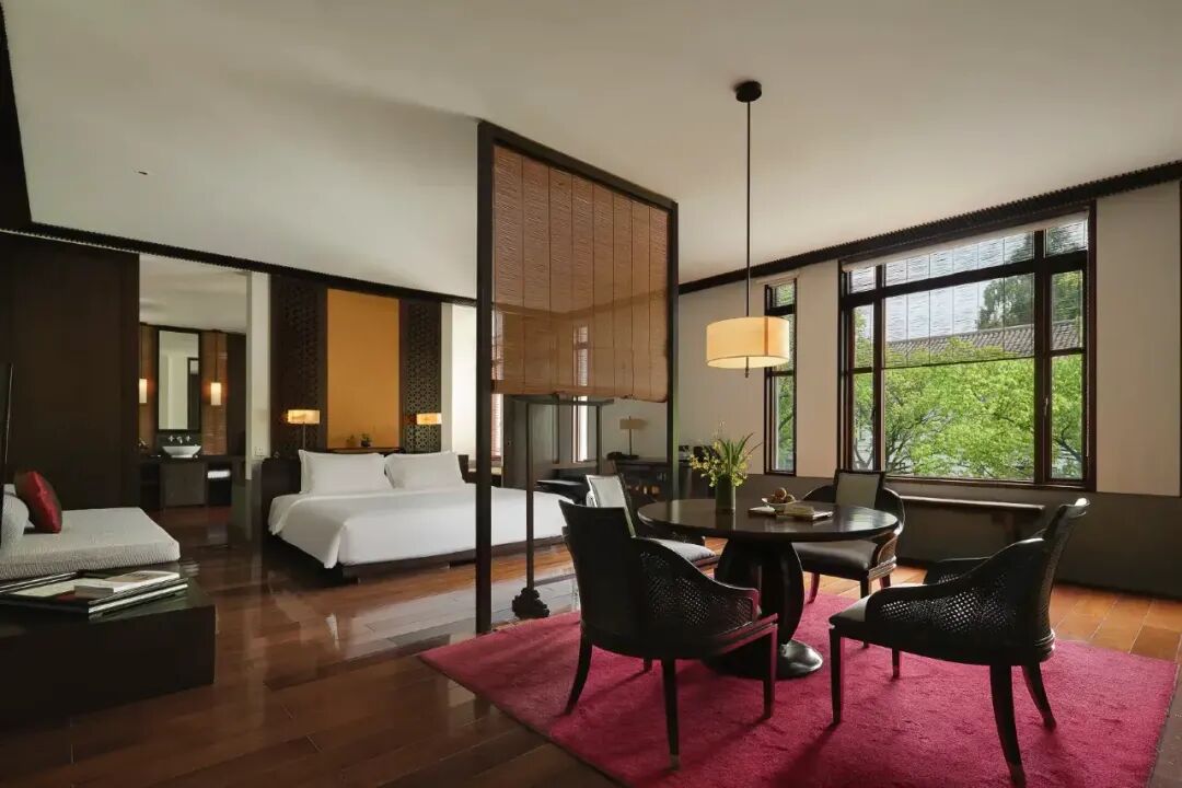 杭州老牌顶奢酒店,位于富春江畔,隐于葱茏翠绿的山峦之间,俯瞰富春江,设计灵感就来自于《富春山居图》,宁静典雅、充满禅意。