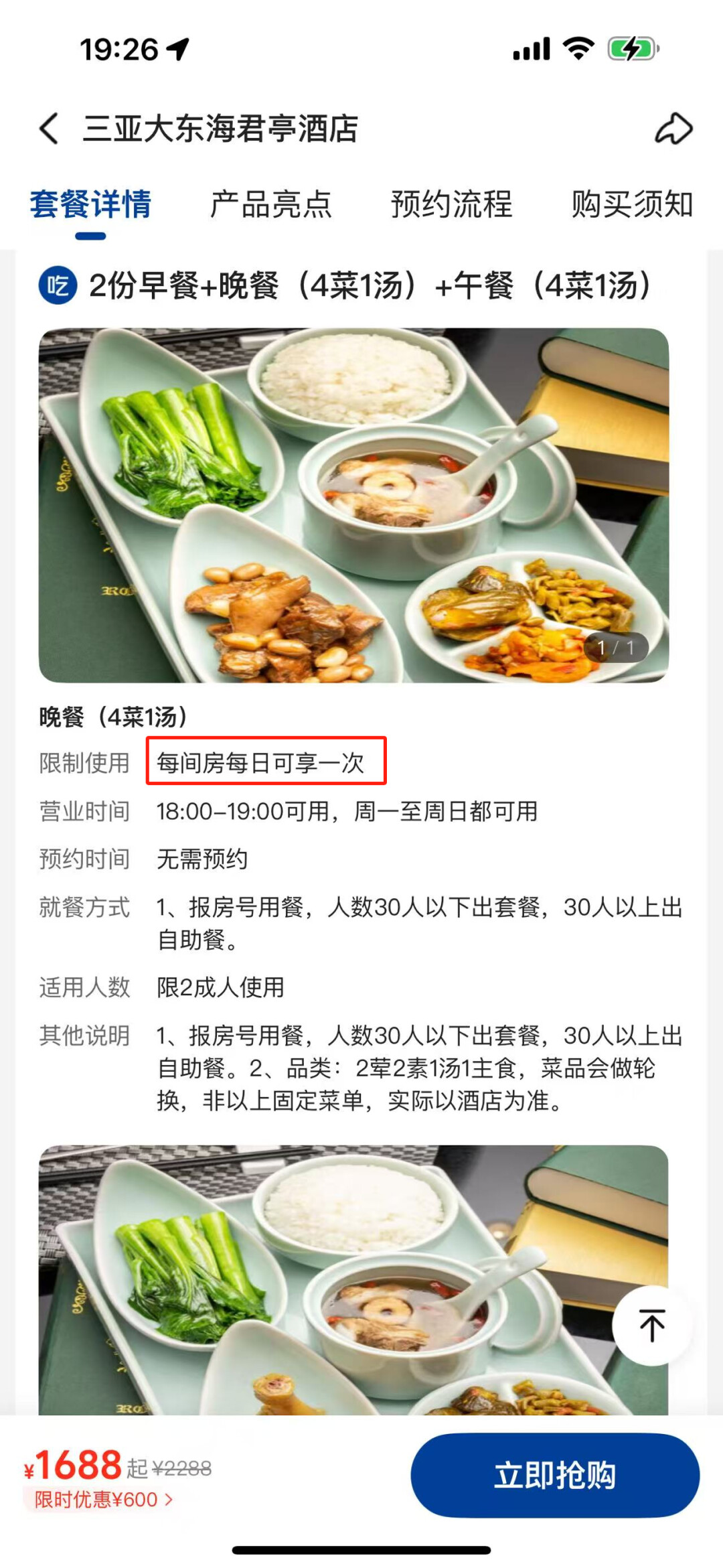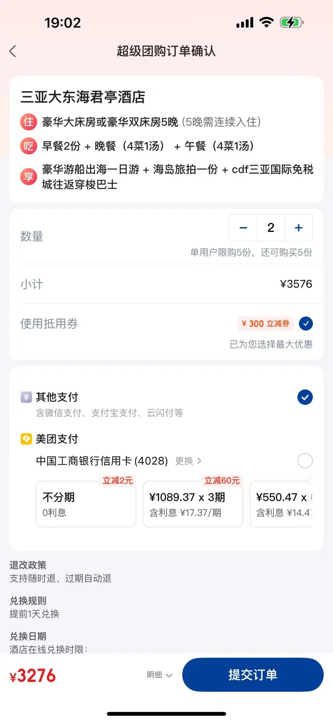 拍2份可用上面满2998-300的券,券后328元/晚,可留1份退1份。