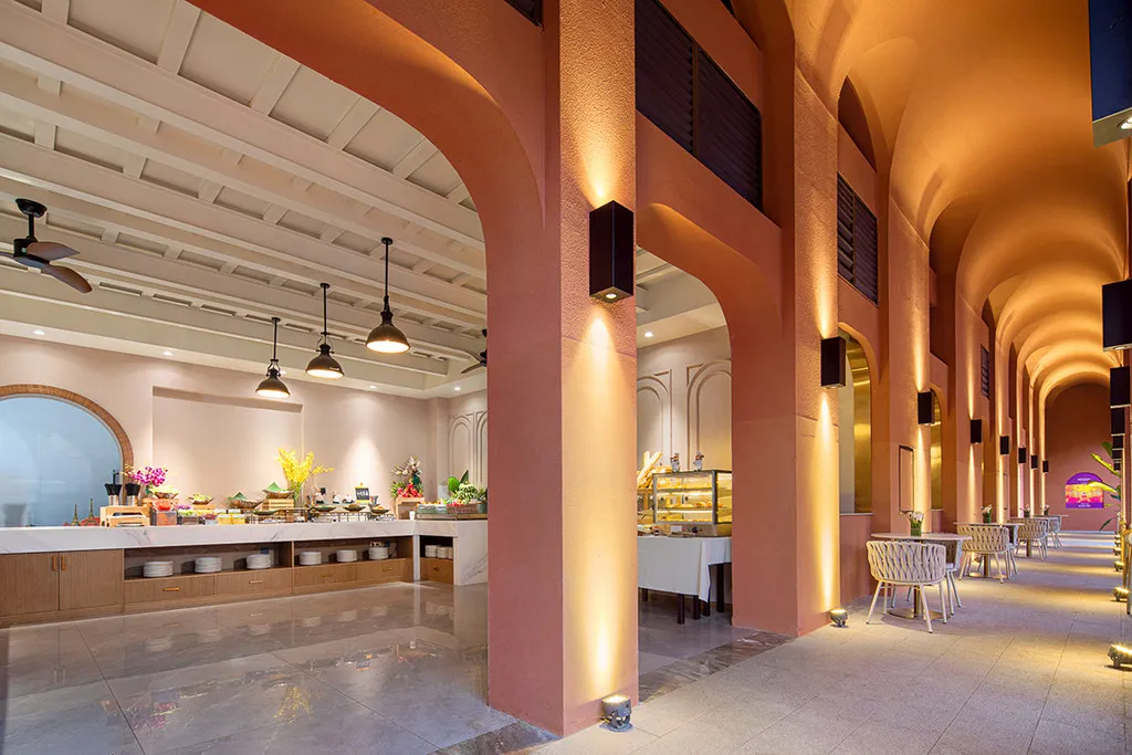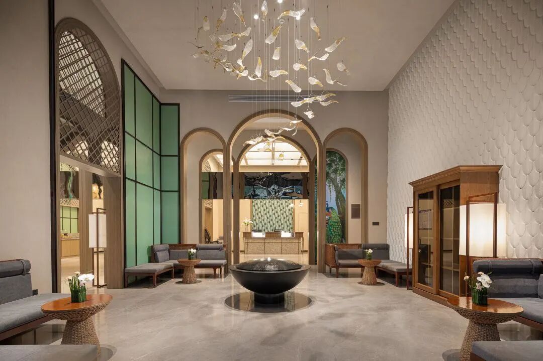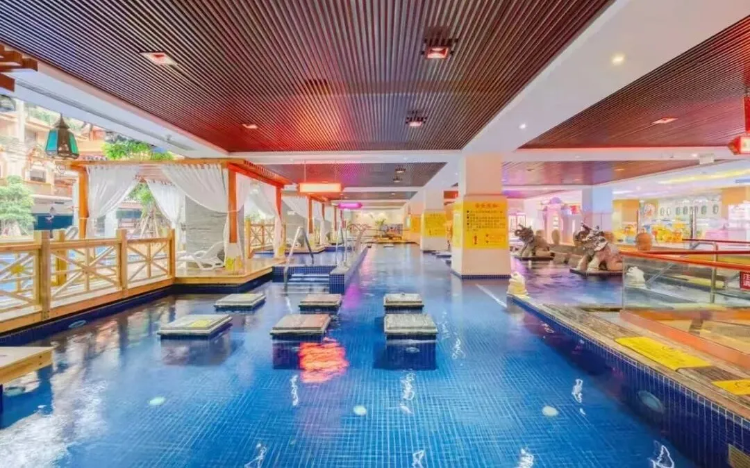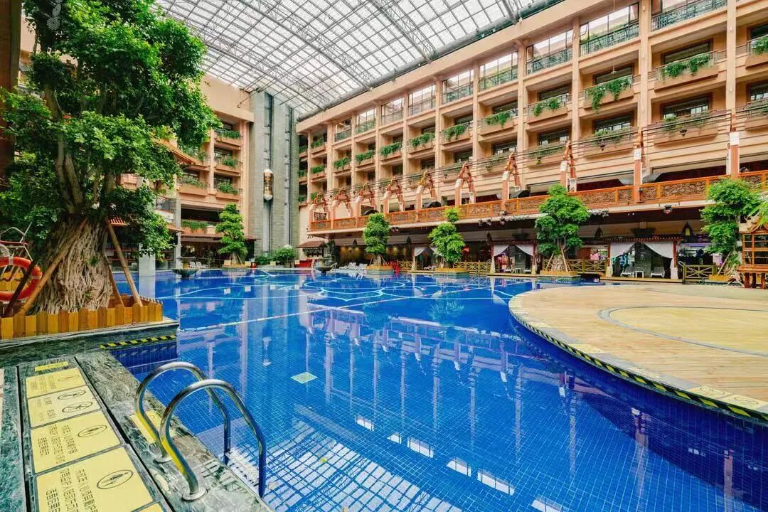 酒店以东南亚风格为设计主线,融合热带植物景观,营造出浓郁的泰式度假氛围。核心亮点在于其完善的温泉与理疗设施,包括1130㎡室内恒温泳池与儿童戏水区、18个户外温泉泡池、盐蒸房及专业SPA理疗中心。
