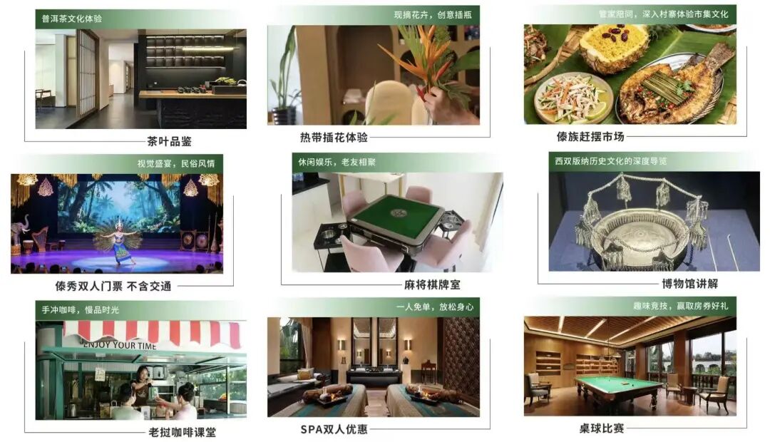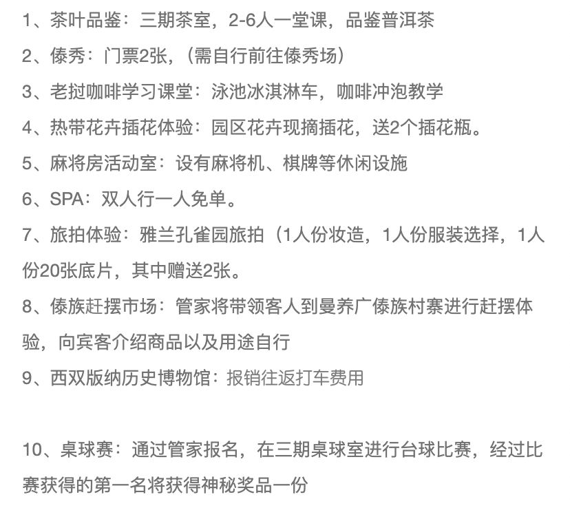除了酒店本身的泳池、健身房和儿童乐园,套餐还提供10大专属权益。活动设计的挺贴心,比如品茶课堂、制作老挝咖啡、插画等,都是版纳当地值得体验的特色活动。