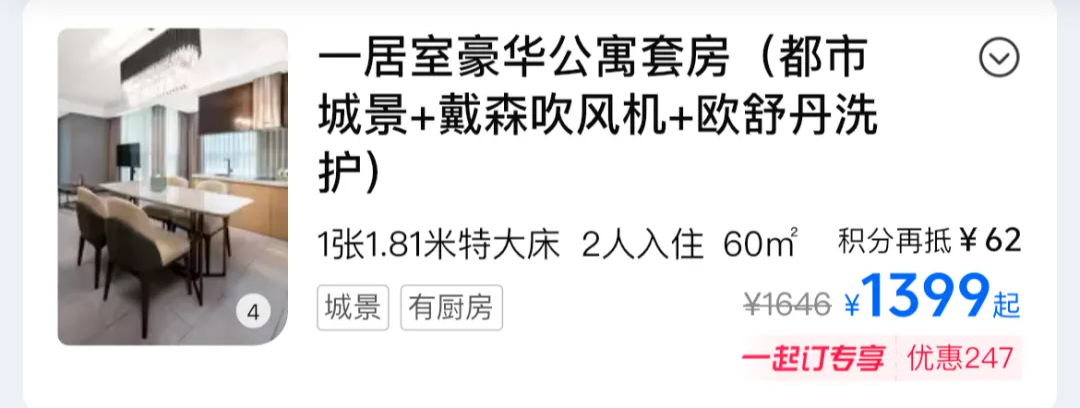 套餐给的是60m²的豪华公寓套房,公寓式设计,厨电齐全,标配戴森和欧舒丹洗护。套餐券后700出头/晚,差不多在日历房的5折,非常划算。