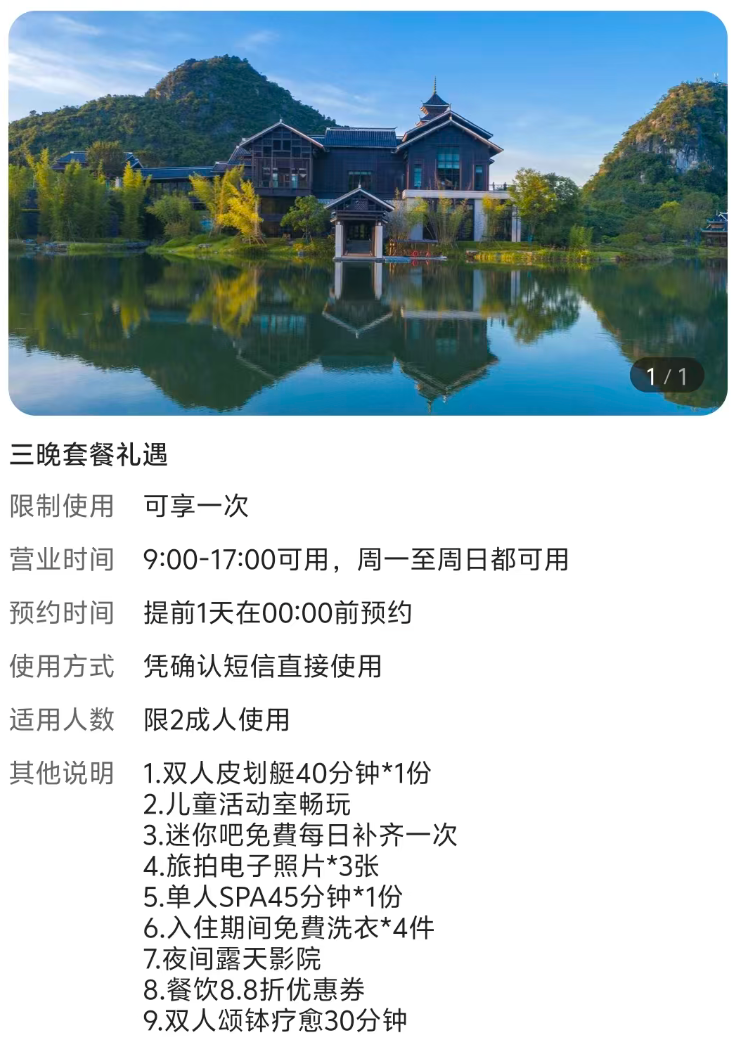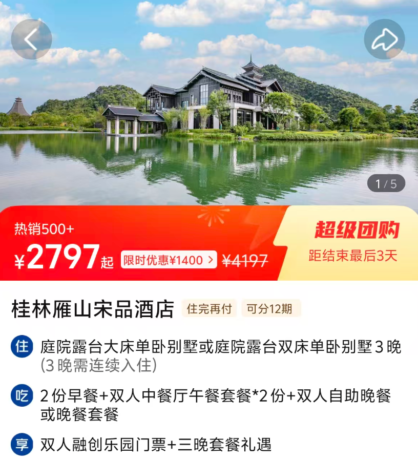 * **桂林雁山宋品酒店**(3晚2797元),提供191平米单卧别墅、多顿餐饮及融创乐园门票,打造沉浸式山水度假体验。