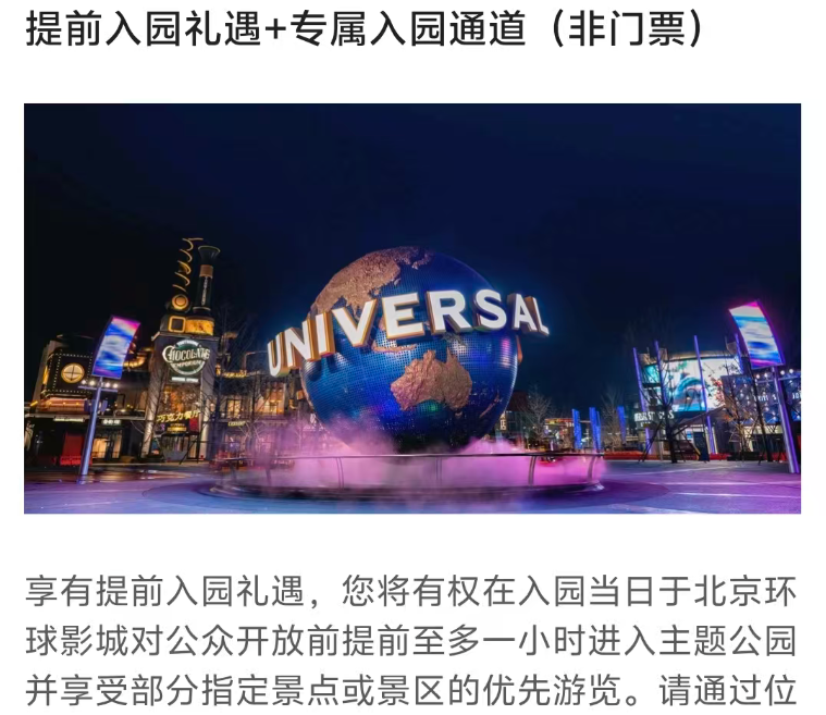 * **北京环球影城官方酒店通兑**(1晚1049元),含提前一小时入园权益,价值极高。