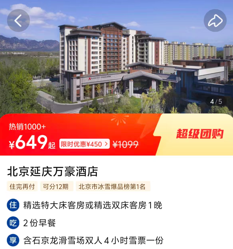 * **北京延庆万豪酒店**(1晚632元),赠送双人石京龙滑雪票,适合冬季滑雪。