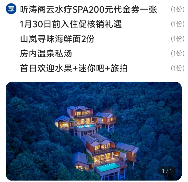 宁波宁海安岚2晚+首日欢迎水果+迷你吧+旅拍+山岚寻味海鲜面2份+房内温泉私汤+听涛阁云水疗SPA200元代金券 - 券后2699元(拍1份用-200券)