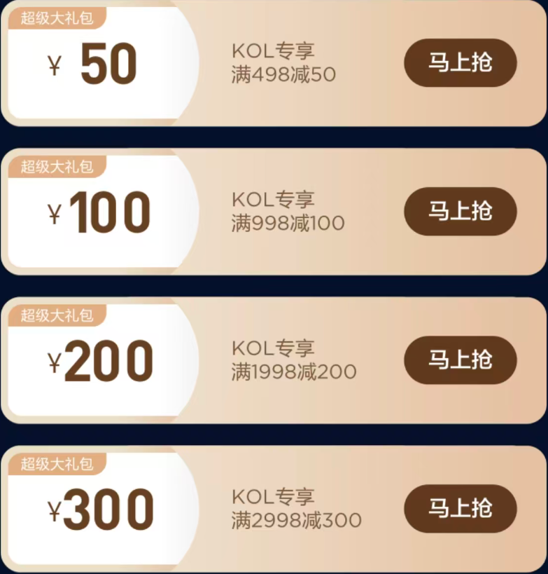 囤货之前先进直播间领券:498-50、1998-200、2998-300: