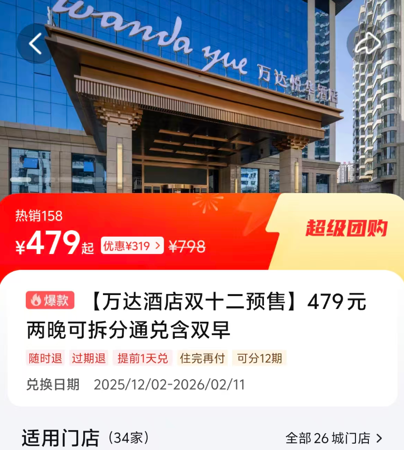 【万达酒店双十二预售】478元两晚可拆分通兑含双早 - 券后439元起(拍5份用-200券)