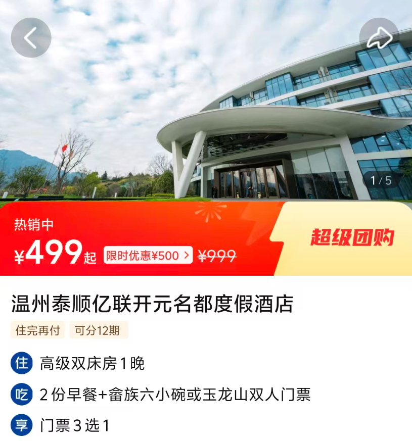 * **温州泰顺亿联开元名都度假酒店**(1晚499元),赠送景点门票,方便探索泰顺氡泉及山水。