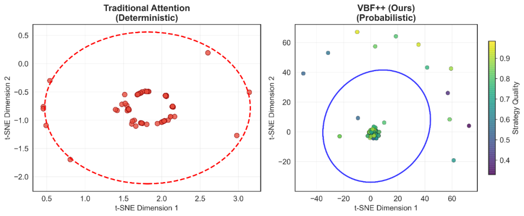 VBF++ 最大的优势在于保持推荐准确性的同时,量化了融合策略的可信度。图 4 展示了传统注意力机制与 VBF++ 在对同一视频进行 100 次推理时,其融合策略在潜在空间中的分布差异: