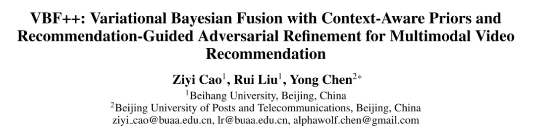 Cao, Z., Liu, R., & Chen, Y. (2025). VBF++: Variational Bayesian Fusion with Context-Aware Priors and Recommendation-Guided Adversarial Refinement for Multimodal Video Recommendation. Beihang University & BUPT.
