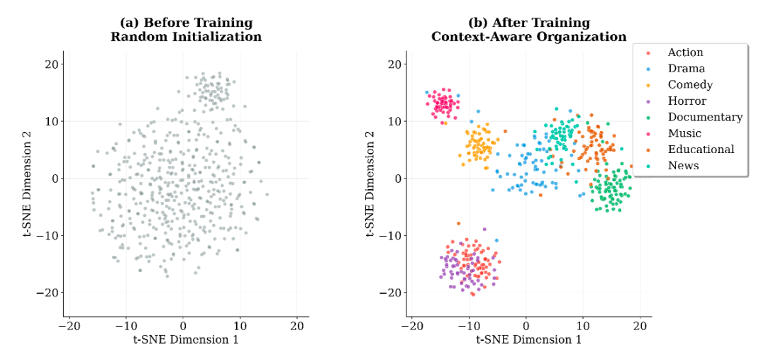 图 2 训练前后融合策略的 t-SNE 可视化。训练后策略自动聚类成有意义的语义群组。