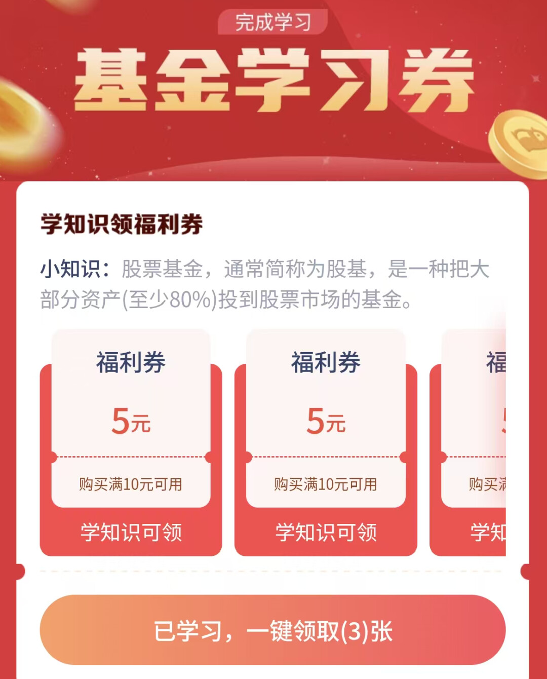 一句话概括:用券后花费5元买10元基金,T+0.5赎回获得10元。3张券可参与3次,合计15元毛。