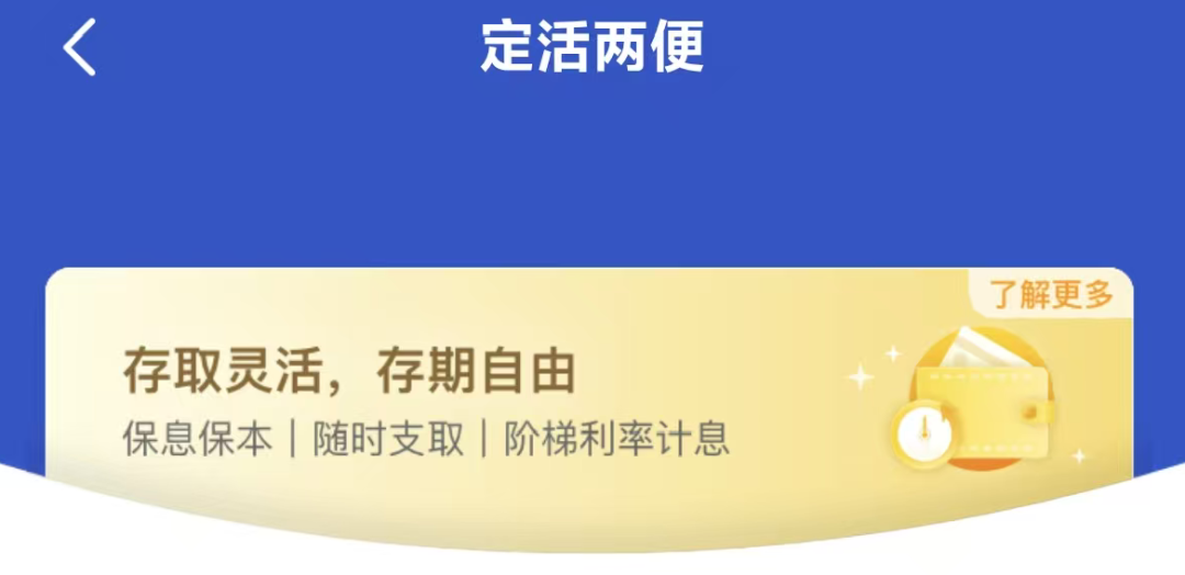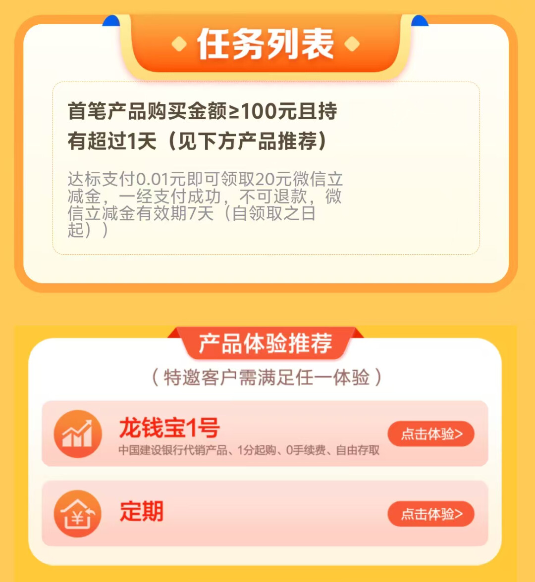 活动内容:持有建行借记卡的小伙伴,首次参与“定活两便”产品活动,存入100元并持有满1天,1-3个工作日后即可领取10元微信立减金。