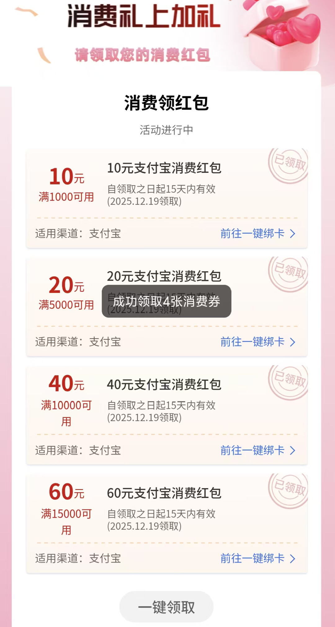 在活动页面下方,还可参与“消费领红包”活动(浙江分行),可无门槛获得4个消费红包: