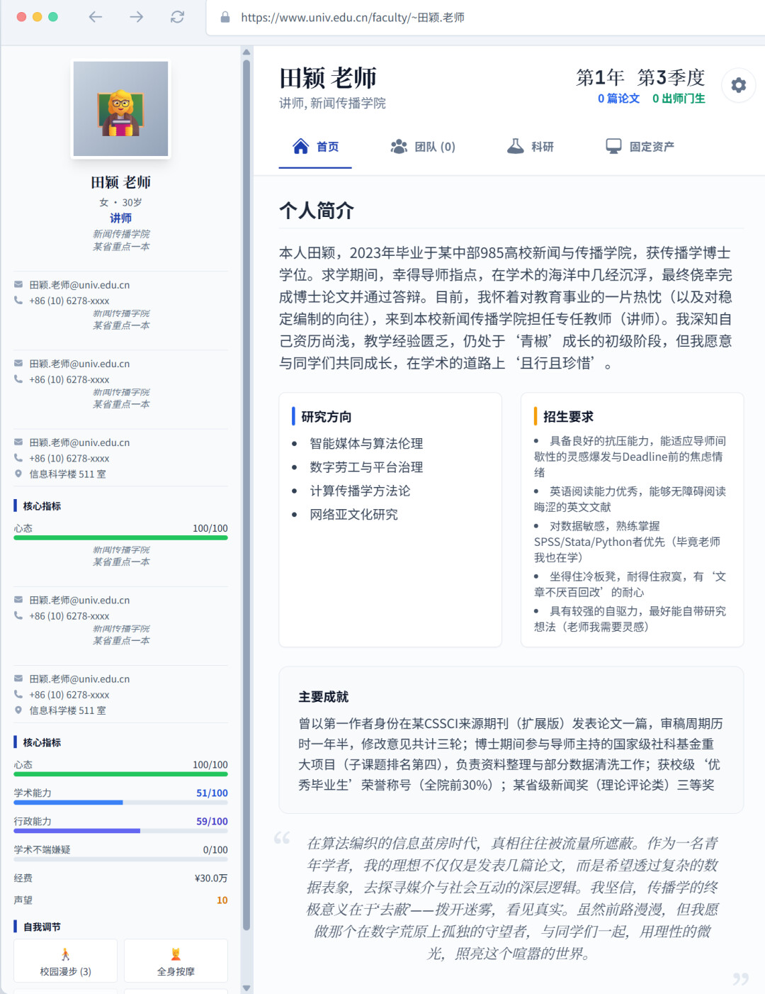 接下来,《青椒模拟器》 直接切换成了高校官网模式。没有过场动画,没有情绪铺垫,页面一跳 —— 田老师的个人主页,正式上线。那一瞬间,熟悉得让人头皮发麻。