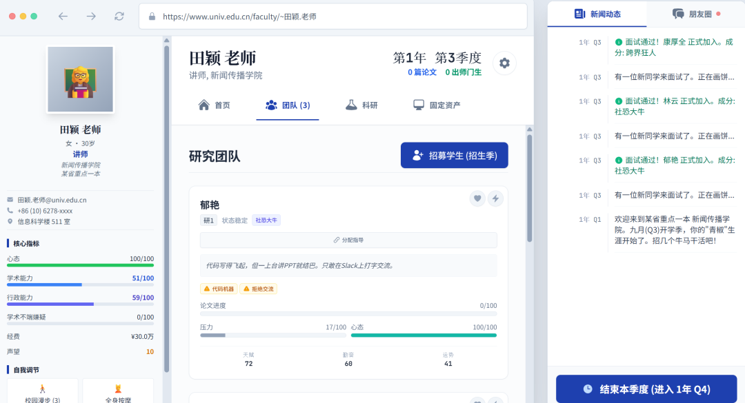 游戏时间以学年为单位推进。一开始,每个人的起点都差不多:职称未定、资源有限、热情尚存,他们会招募团队新成员、申请项目、处理学生遇到的问题、中间还会有各种各样的事务来让你选择,你的每个决定都会影响着之后的评级。