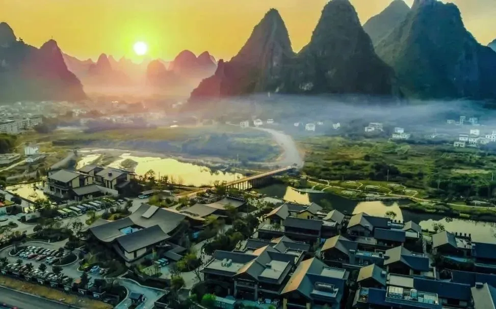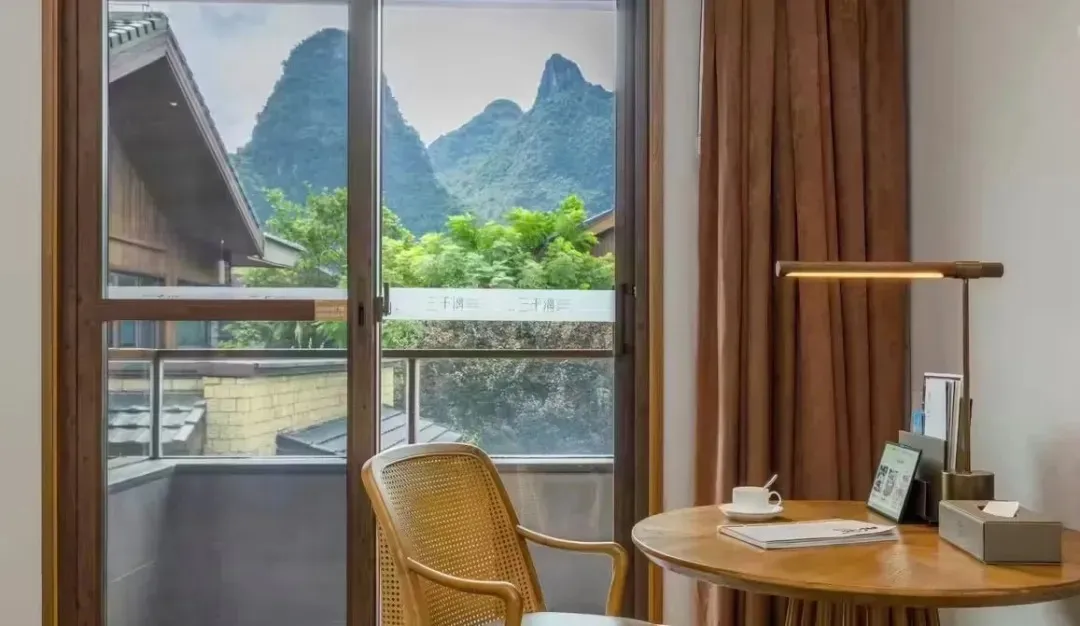 阳朔这家君澜在2019年开业,位置也在兴坪,从酒店看出去就是20元人民币的标志性景观,步行2分钟到漓江,毗邻九马画山、黄布倒影。