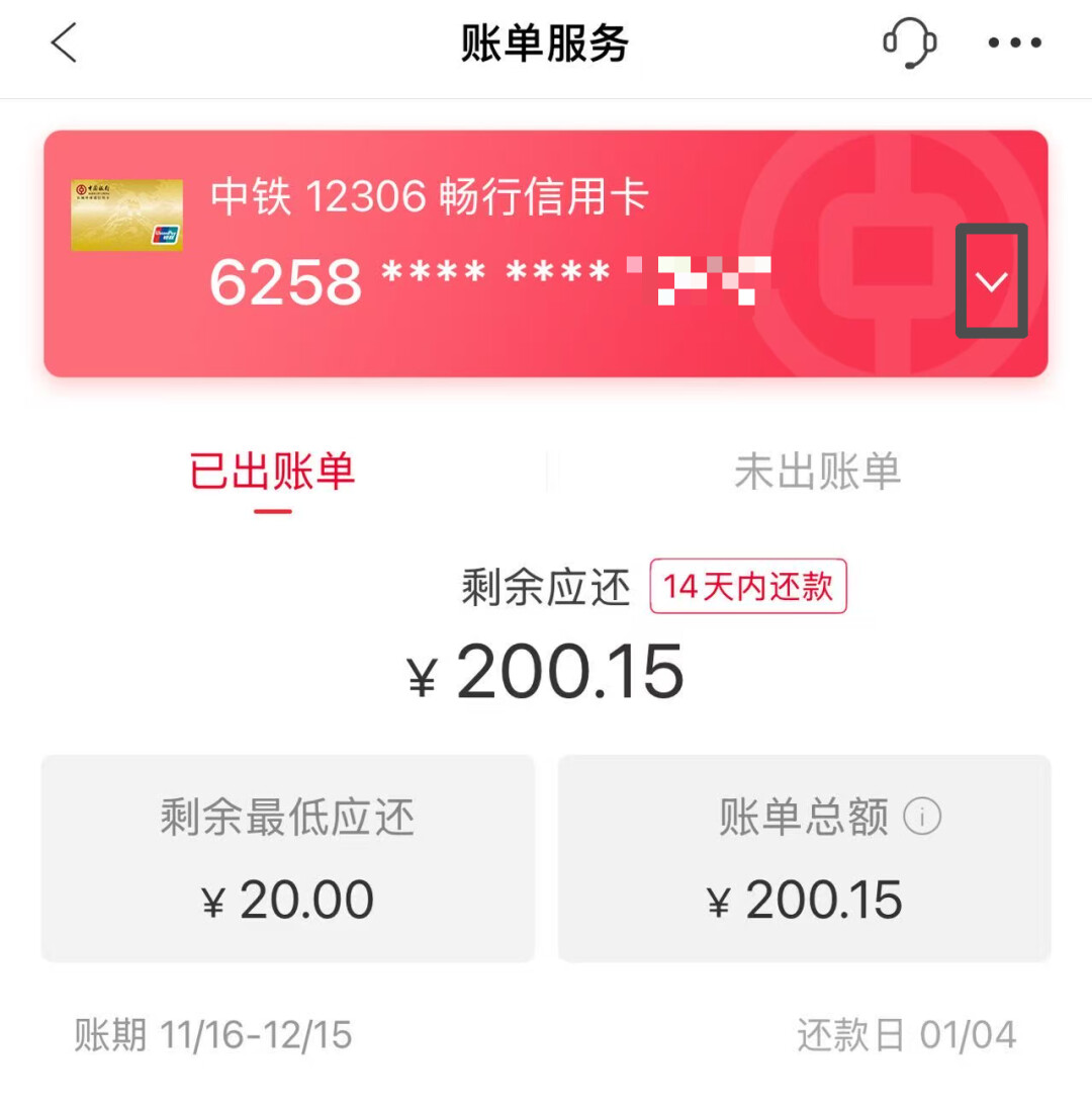 这里不得不先吐槽中行的缤纷生活APP,反人类设计,多张卡要点下拉箭头,然后逐张选择,才能看到每张卡的账单。