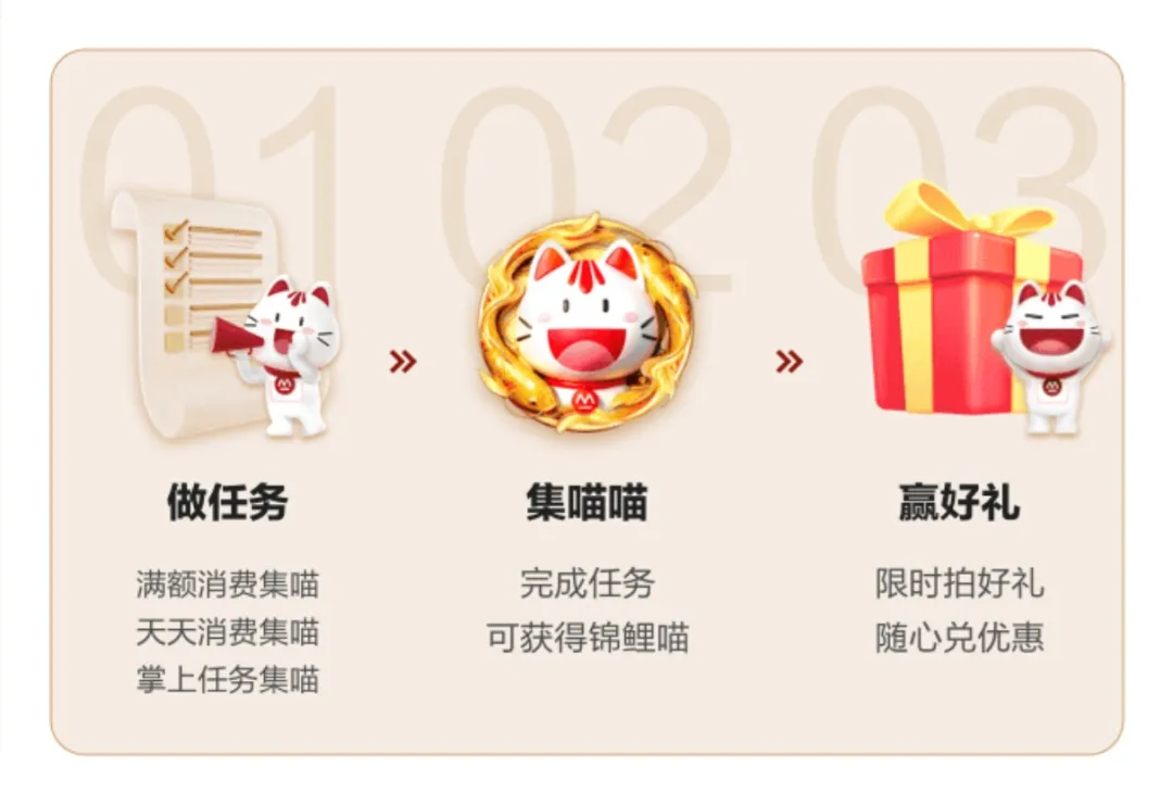 天天消费集喵:单日累计消费满 99 元,可获得 1 个喵(上限 20 只喵,天数无需连续)