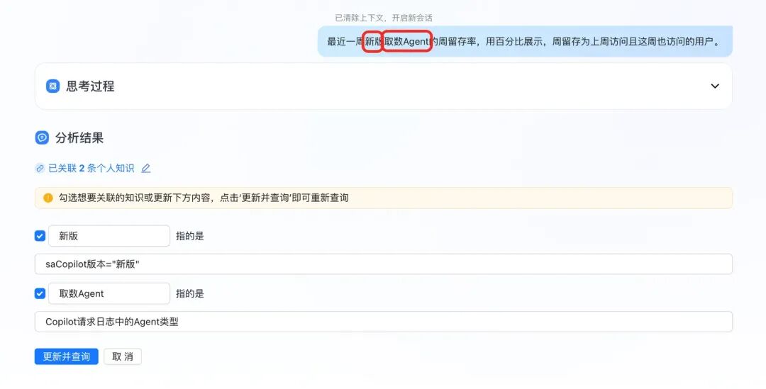 上面这个案例中就会有两个信息大模型不理解:一个是“新版”,一个是“取数Agent”。而这里我们就会模拟人类对话,在对话过程中,如果发现对方说的话有不太理解的地方,进行反问澄清。这个在人类对话中是一个非常常见的对齐信息的方式。