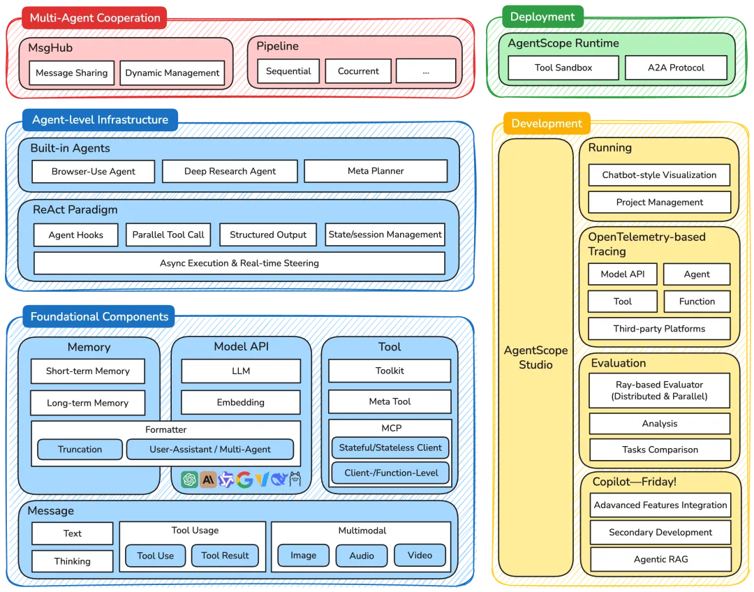 最上层的开发与部署层 (Deployment & Devvelopment)则体现了 AgentScope 对工程化的重视。AgentScope Runtime 提供了生产级的运行时环境,而 AgentScope Studio 则为开发者提供了完整的可视化开发工具链。