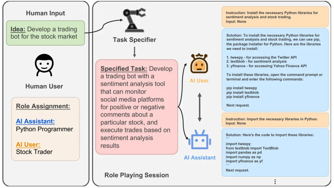 CAMEL:CAMEL 提供了一种新颖的、名为角色扮演 (Role-Playing) 的协作方法[3]。其核心理念是,我们只需要为两个智能体(例如,AI研究员 和 Python程序员)设定好各自的角色和共同的任务目标,它们就能在“初始提示 (Inception Prompting)”的引导下,自主地进行多轮对话,相互启发、相互配合,共同完成任务。它极大地降低了设计多智能体对话流程的复杂度。