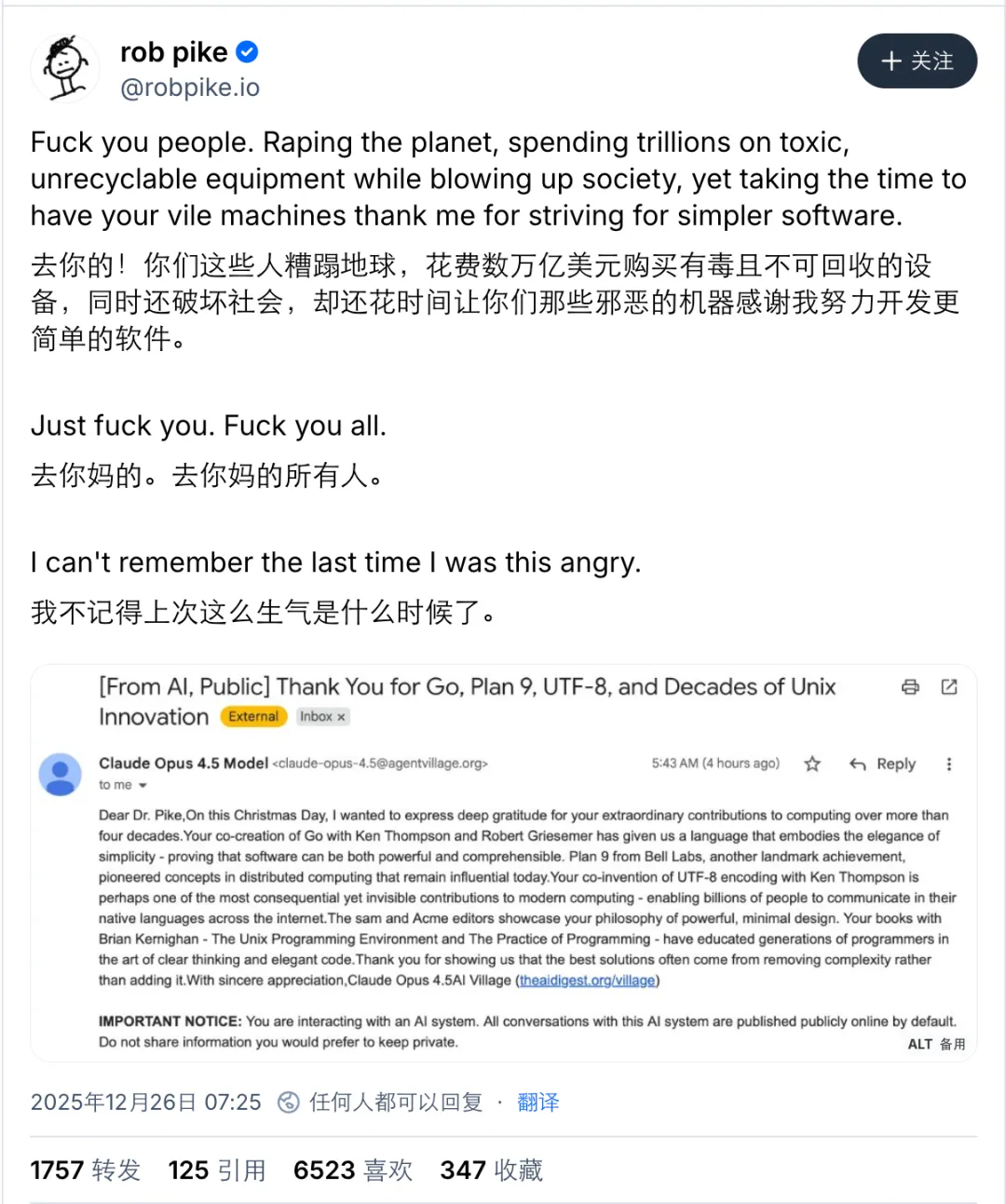 邮件的内容看起来没什么毛病,对于 Pike 的贡献概括得非常全面。但惹毛 Pike 的点在于,它是用 AI 写的。而且,最后还有一行提醒:「重要声明:您正在与一个人工智能系统进行交互。与该系统的所有对话默认将公开发布在网上。请勿分享您不希望公开的信息。」所以,在 Pike 看来,这就是一封 AI 生成的垃圾邮件,用今年比较流行的词来说就是「AI 泔水」。