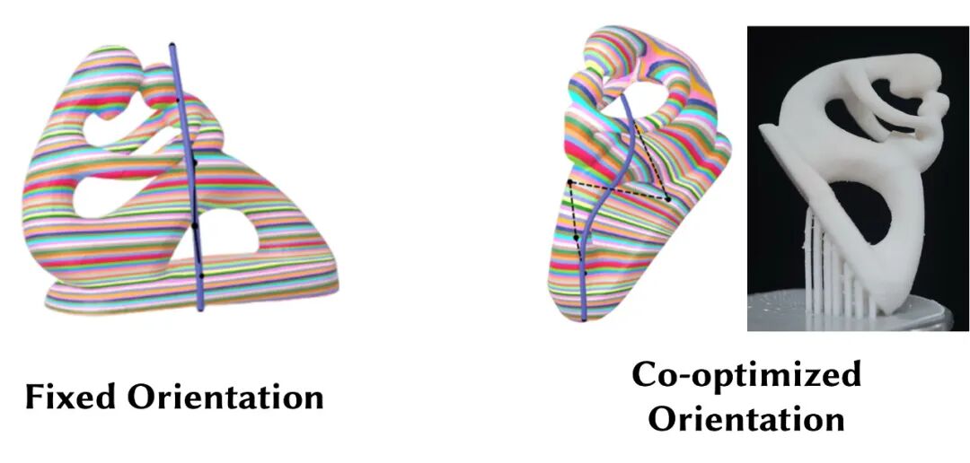 如上图所示,在论文展示的 Fertility 模型中,固定角度下由于存在无法消除的大角度悬垂,优化容易陷入局部极小值(上图左侧)。而引入 Q 联合优化后,算法自动收敛至一个特定的倾斜角度(上图右侧),使得所有悬垂区域的法向与打印方向的夹角均满足无支撑阈值,从而在不添加任何支撑的情况下完成了制造 。