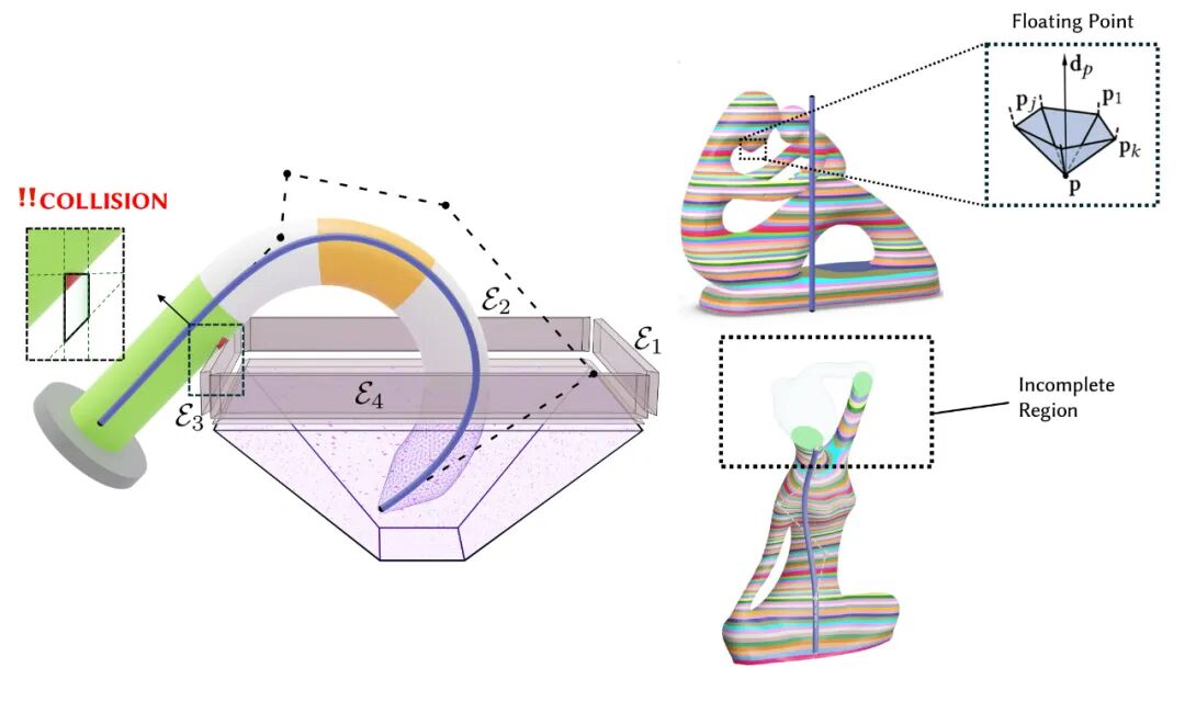 在多轴系统下,切片不再是简单的几何截面计算,而演变成了一个受到严格物理约束的机器人运动规划问题 。算法必须在生成切片的同时,实时处理多个维度的耦合约束:每一层切在哪?机械臂怎么动才不会撞到树脂槽?如何保证上一层和下一层连得上?