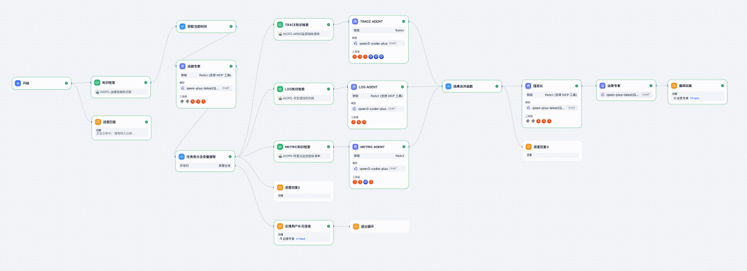 Dify 工作流引擎负责编排上述 MCP 工具调用逻辑,利用React模式对复杂问题进行自行拆解和迭代,多次改写问题并多次执行工具调用从而生成质量更优的结果。例如,当检测到服务延迟异常时,工作流首先调用 Metric MCP 获取关键性能指标,若发现 CPU 或内存异常,则进一步调用 Log MCP 查询相关错误日志;同时通过 CMDB MCP 获取该服务依赖的上下游组件,结合 Trace MCP 分析调用链瓶颈,最终由大模型综合多源信息输出根因假设与处置建议。