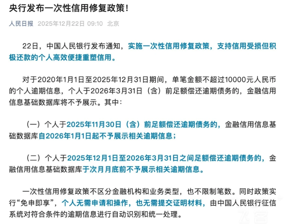 最后,是一则重磅消息:人行今天公布了一次性信用修复政策!不用跑网点、不用填材料,符合条件直接自动修复征信。