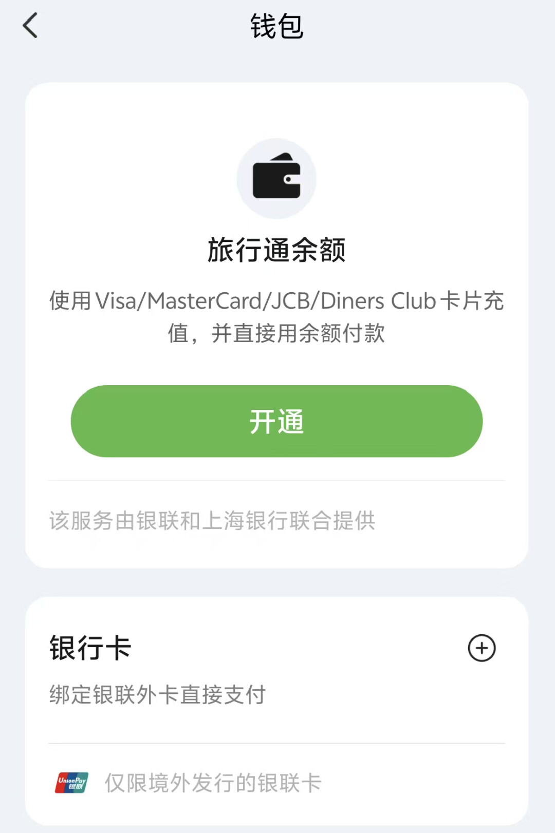 “钱包”的功能分为两部分:“旅行通余额”和“银行卡”。