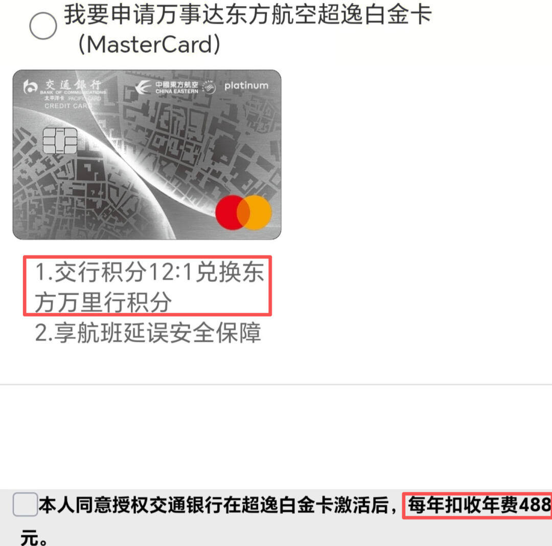 万事达东方航空超逸白金卡。年费488元/年,消费12:1累积东航里程。
