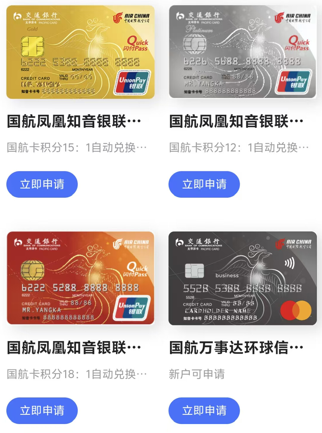 那么加上这张,目前交行的国航联名卡已经有4款,分别是: