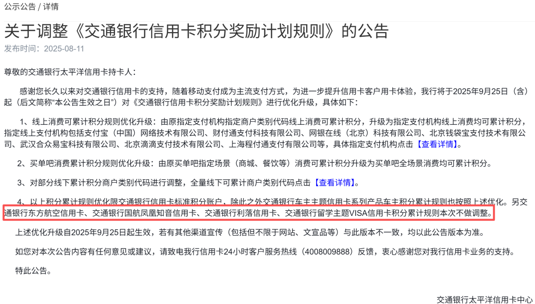 你以为这是bug,迟早会被修复?不不,交行似乎早就知道这一点,也在今年8月发布了公告,将非联名卡的积分从“指定支付机构指定商户类别代码线上消费可累计积分”调整为“指定支付机构线上消费均可累计积分”。一举解决了漏分的情况。但是!航司联名卡除外: