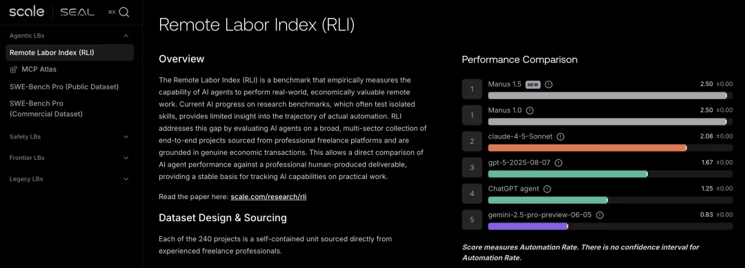 从 3 月到现在,我们在欧洲、美国跑了很多地方,参加了很多会,也和很多创始人和企业领袖交流。我觉得到目前为止,在整体性能表现以及各种 Benchmark 上,Manus 都长期保持第一,包括 Scale AI 前段时间发布的新指标 RLI(远程劳动力指数)。
