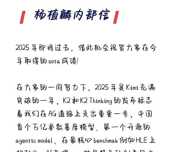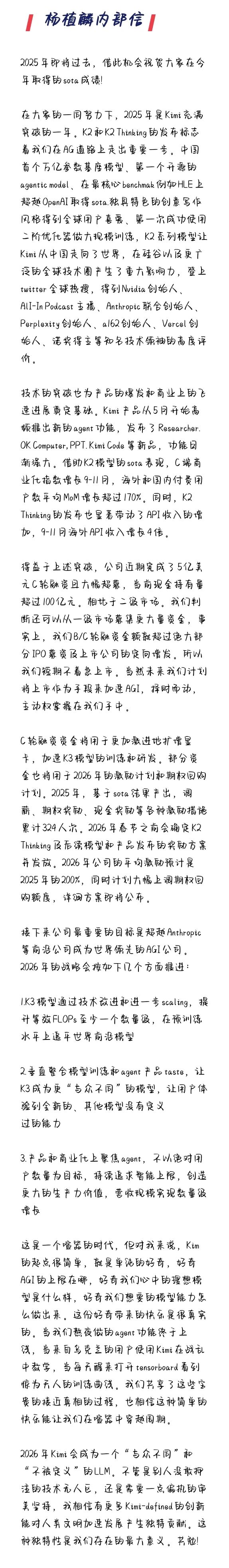 月之暗面创始人杨植麟发布内部信,宣布完成5亿美元C轮融资,由IDG领投,老股东阿里、腾讯、王慧文超额认购,公司估值达43亿美元。融资资金将用于扩增显卡、加速K3模型训练和研发,并大幅提高2026年员工激励计划和期权回购额度。杨植麟还公布了公司2026年战略目标:预训练水平追平世界前沿模型,打造更“不同”的K3模型,实现营收规模数量级增长,商业化方面聚焦Agent,提升智能上限。目前公司现金持有量超100亿元,短期不着急上市。受益于K2 Thinking大模型,海外API收入增长迅速。