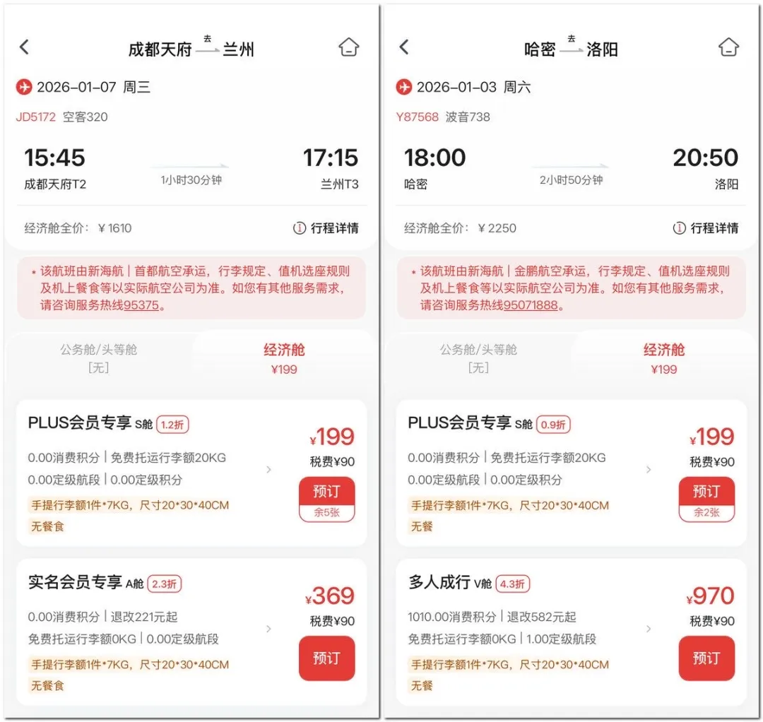 1. “回流”票机制,每天上午10点后可预订经济舱PLUS会员专享价售罄后退票的航班,提升了购票灵活性,即使当天也能有机会买到票。