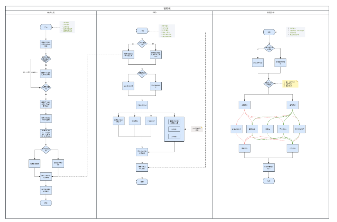 本流程图展示了一套从 PRD(产品需求文档)生成到代码实现的智能化开发流程框架,实现了产品研发过程中从文档到代码生成的一体化闭环。通过智能体对 PRD 的深度解析和逐步拆解,从需求定义到模块生成,再到代码输出。使得系统分析到代码实现的过程更加高效、规范。