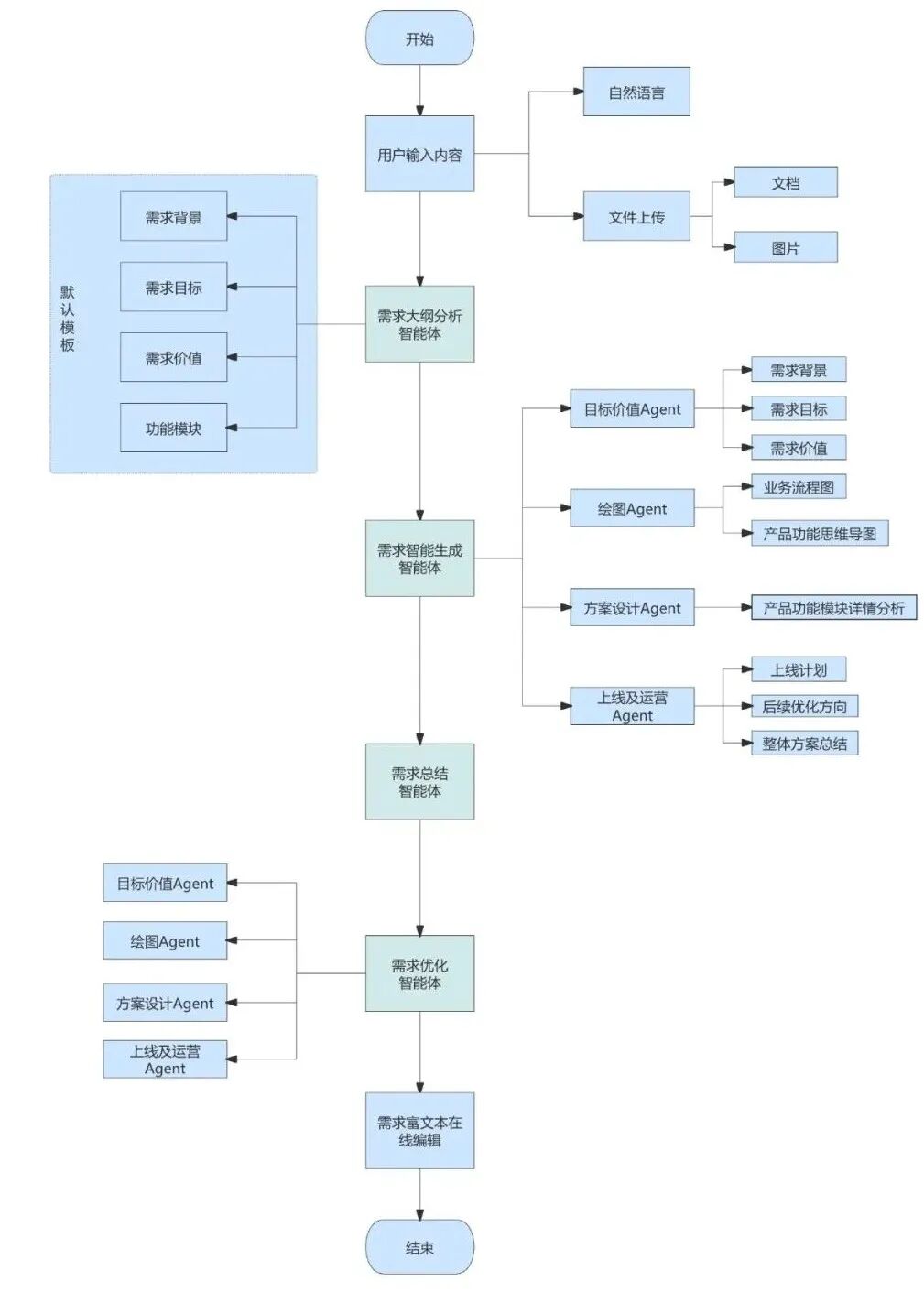 本流程图展示了PRD(产品需求文档)生成智能体的整体运行机制,通过大模型实现高效、规范和自动化的文档编写与需求处理。整个流程覆盖了从需求输入、分析、生成、优化到文档编辑的完整生命周期,帮助产品团队快速生成高质量的PRD,减少人工干预。