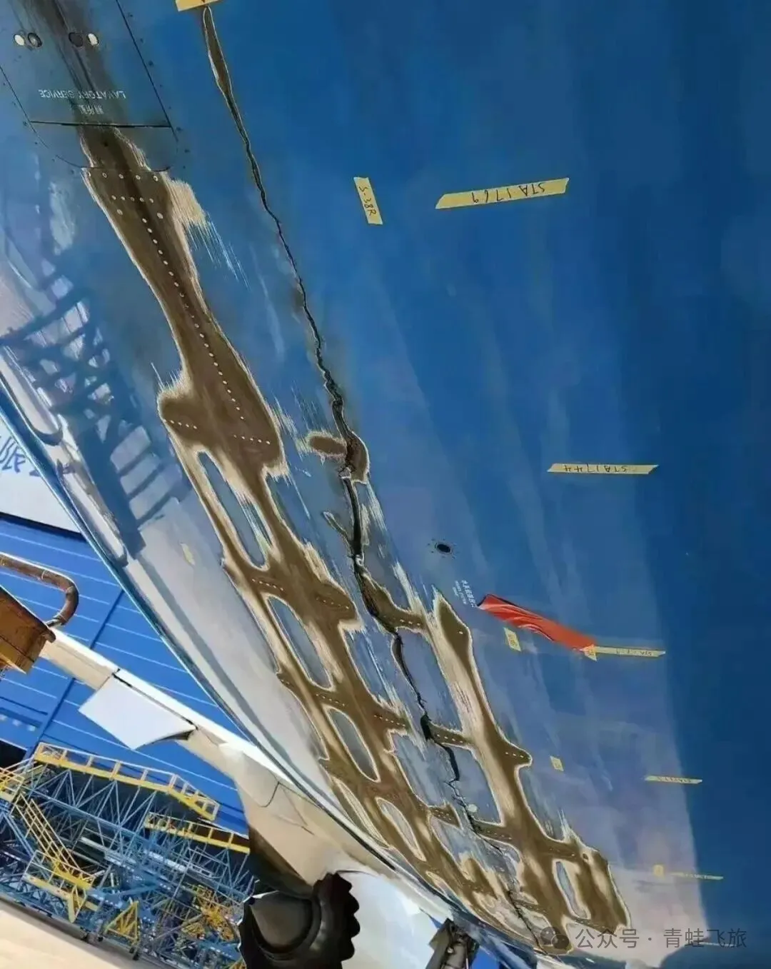 据说采用的修复方案是整体更换。就是将与受损部位相关部分全部移除,然后重新生产一个相同的新的蒙皮,用螺栓和铆钉重新固定好。