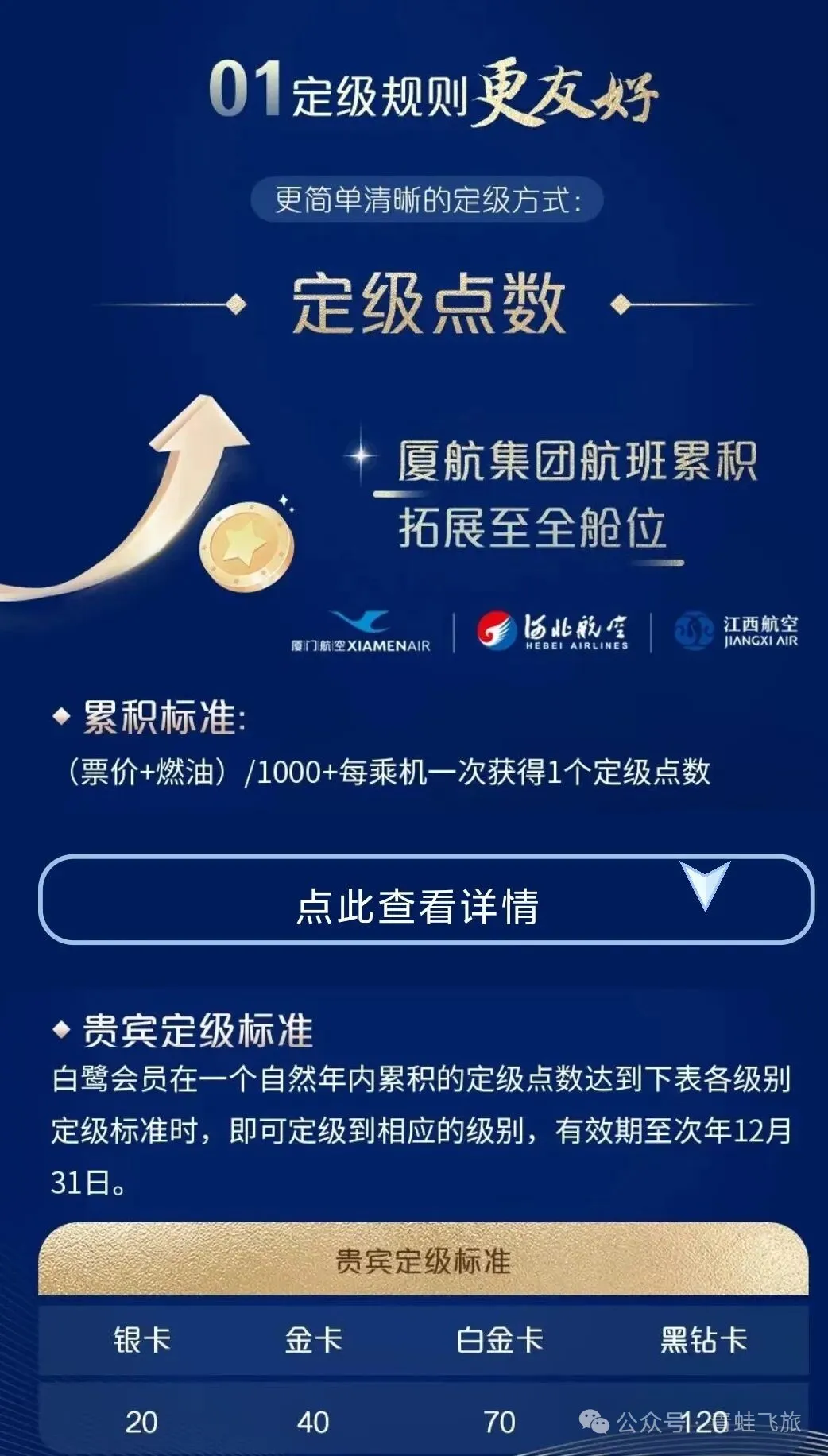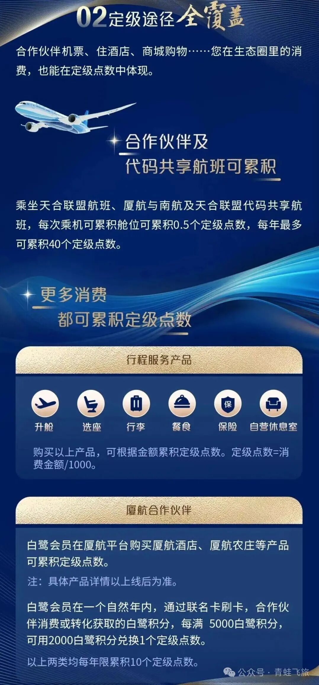 【2026.1.1更新】厦航正式官宣新会员体系,现在变成了一种混合体,每坐一次给一个定级点数,消费满1000也给一个定级点数,120点定级黑钻(感觉越来越多航司会采取收益制,只要权益足够好小蛙觉得收益制也合理)!