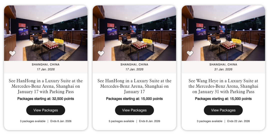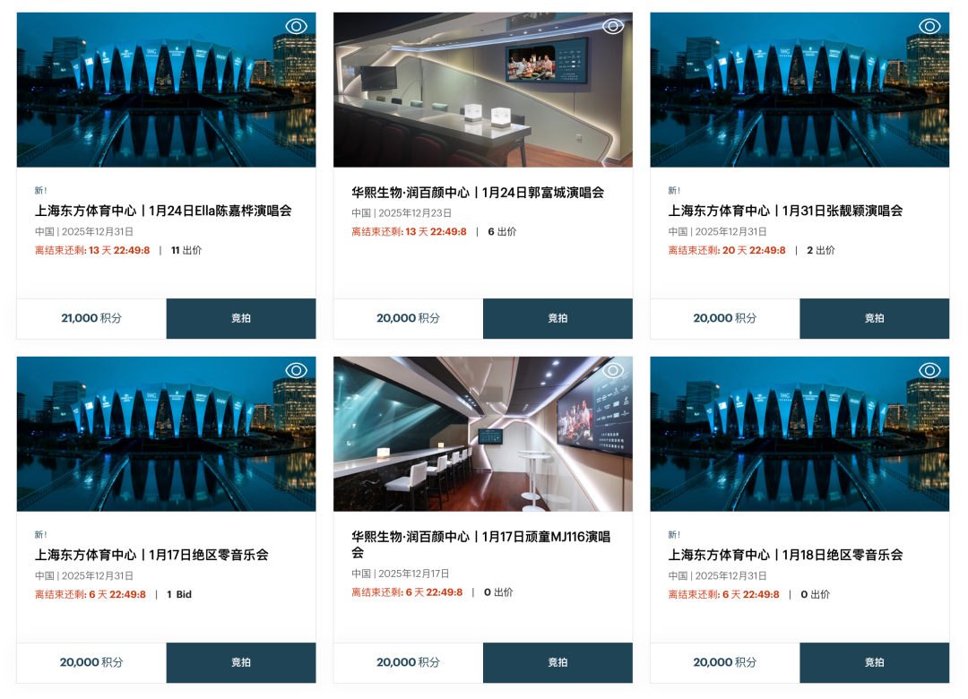 比如1月的王心凌上海演唱会,其中1套包含2张梅赛德斯中心的包厢票和1晚上海艾迪逊的套房,经过17轮竞价最后飙到了17万分。