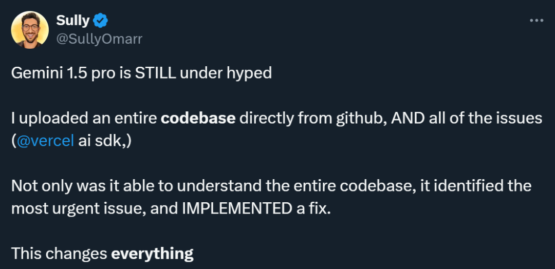 很多测试过 Gemini 1.5 Pro 的人都表示,这个模型被低估了。比如有人尝试将从 Github 上下载的整个代码库连同 issue 都扔给 Gemini 1.5 Pro,结果它不仅理解了整个代码库,还识别出了最紧急的 issue 并修复了问题。