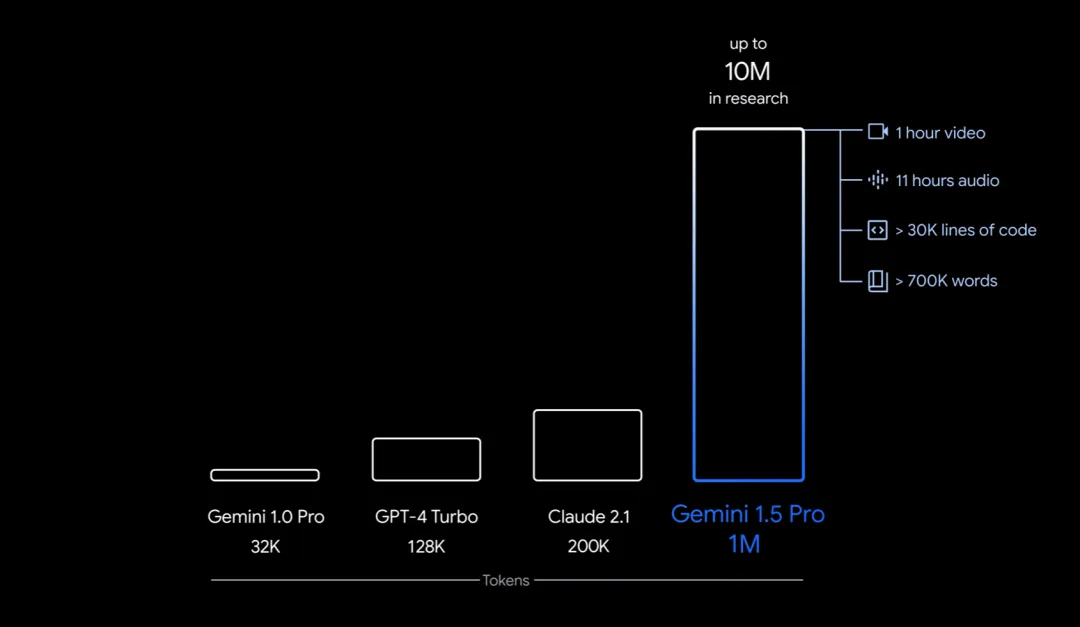 具体来说,谷歌这次推出的是用于早期测试的 Gemini 1.5 的第一个版本 ——Gemini 1.5 Pro。它是一种中型多模态模型(涉及文本、视频、音频),性能水平与谷歌迄今为止最大的模型 1.0 Ultra 类似,并引入了长上下文理解方面的突破性实验特征。它能够稳定处理高达 100 万 token(相当于 1 小时的视频、11 小时的音频、超过 3 万行代码或 70 万个单词),极限为 1000 万 token(相当于《指环王》三部曲),创下了最长上下文窗口的纪录。