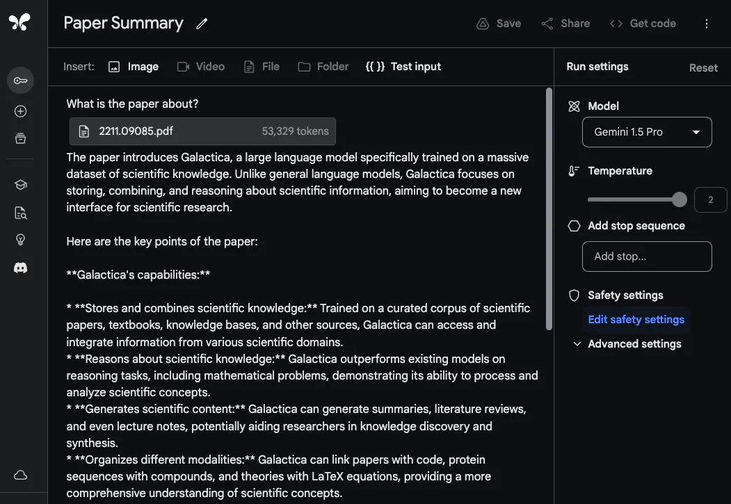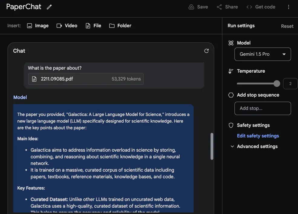 模型的回复准确而简洁,因为它提供了可接受的 Galactica 论文摘要。上面的示例使用的是 Google AI Studio 中的自由格式提示,但你也可以使用聊天格式与上传的 PDF 进行交互。如果你有很多问题想从所提供的文档中得到解答,这是一项非常有用的功能。