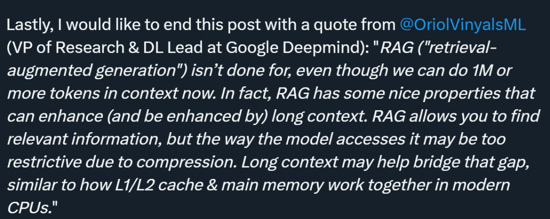 @elvis 最后引用了 Oriol Vinyals(谷歌 DeepMind 的研究副总裁)的话,指出即使现在我们能够处理 100 万或更多 token 的上下文,RAG 的时代还远未结束。实际上,RAG 具有一些非常好的特性。这些特性不仅可以通过长上下文模型得到增强,而且长上下文模型也可以通过 RAG 得到增强。RAG 允许我们找到相关的信息,但是模型访问这些信息的方式可能由于数据压缩而变得过于受限。长上下文模型可以帮助弥补这一差距,这有点类似于现代 CPU 中 L1/L2 缓存和主内存是如何协同工作的。在这种协作模式下,缓存和主内存各自承担不同的角色,但又相互补充,从而提高了处理速度和效率。同样,RAG 和长上下文的结合使用,可以实现更灵活、更高效的信息检索和生成,充分利用各自的优势来处理复杂的数据和任务。