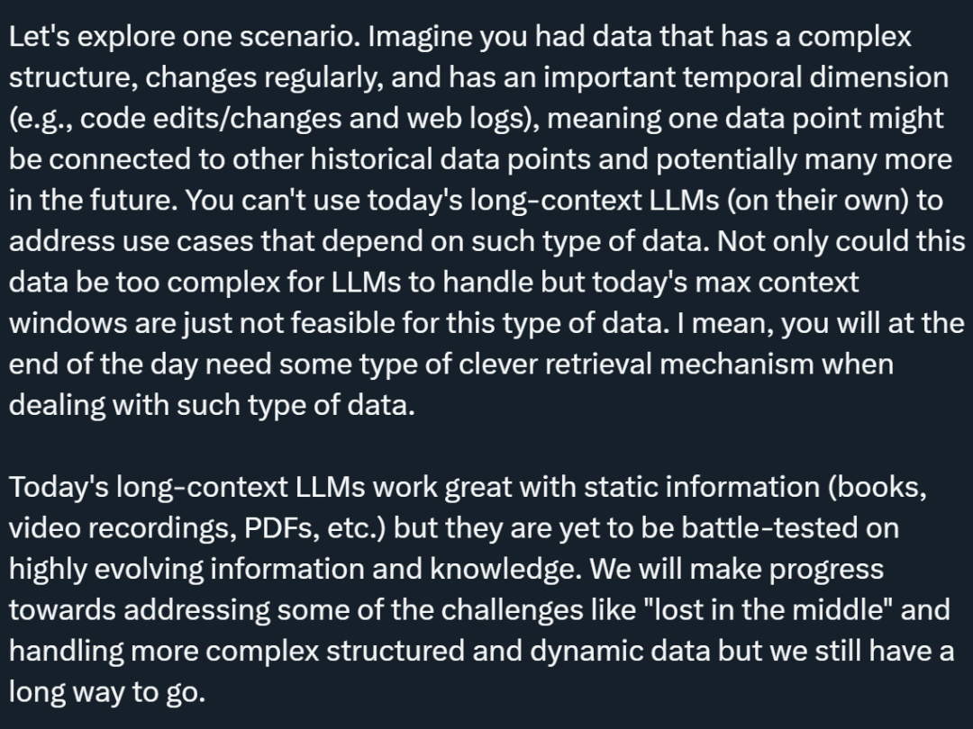 2、对动态信息的处理:今天的长上下文 LLM 在处理静态信息(如书籍、视频录像、PDF 等)方面表现出色,但在处理高度动态的信息和知识方面尚未经过实战测试。@elvis 认为,虽然我们将朝着解决一些挑战(如「lost in the middle」)以及处理更复杂的结构化和动态数据方面取得进展,但我们仍有很长的路要走。